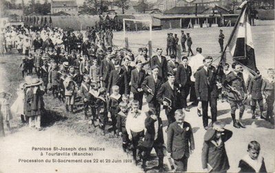 Carte postale ancienne de Tourlaville : paroisse Saint-Joseph des Mielles - procession du Saint Sacrement des 22 et 29 juin 1919.