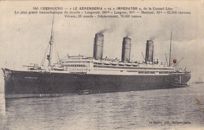 Carte postale ancienne de Cherbourg : N°540 - Le Paquebot "LE BERENGERIA" ex "IMPERATOR" de la Cunard Line - Le plus grand transatlantique du monde - Longueur 280m - Largeur 30m - Hauteur 80m - 62000 chevaux -Vitesse 23 noeuds - Déplacement 70000 tonnes.