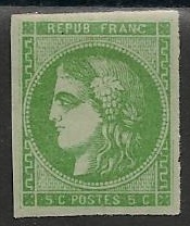 Timbre de France Classique N° 42B du catalogue Yvert et Tellier : 5 centimes vert jaune - report 2, émission de Bordeaux.