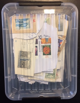 Philatélie 50 à Cherbourg, vous propose une boîte de 100 grammes de timbres Tous Pays non décollés.