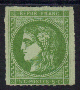 Timbre Classique de France N° 42B du catalogue Yvert et Tellier : 5 centimes vert jaune, émission de Bordeaux.