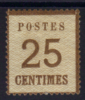 Timbre dit d'Alsace Lorraine N° 7b du catalogue Yvert et Tellier, burelage renversé : 25 centimes brun noir.