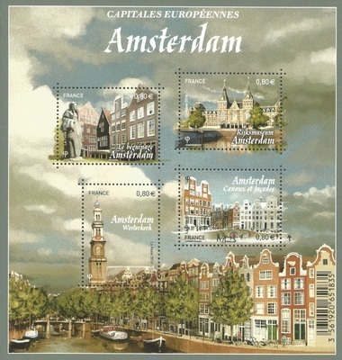 Mini feuille composée de 4 timbres de France N° F5090 du catalogue Yvert et Tellier émise en 2016 : capitales européennes, Amsterdam.